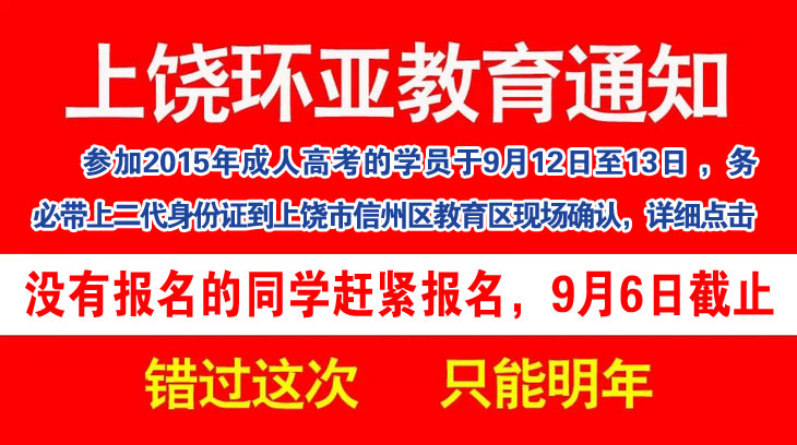 上饒環(huán)亞教育通知:參加2015年成人高考的學員于9月12日至13日(這兩天是星期六與星期天),務必帶上二代身份證到上饒市信州區(qū)教育局現(xiàn)場確認,(注:如這兩天不能來的學員,也可以于:9月7日至15日期間來),確認規(guī)則:按來到的先后順序排隊;確認地址:上饒市中山西路170號(逸夫小學邊信州區(qū)教育局二樓),現(xiàn)場一律找我校殷老師:13307937133